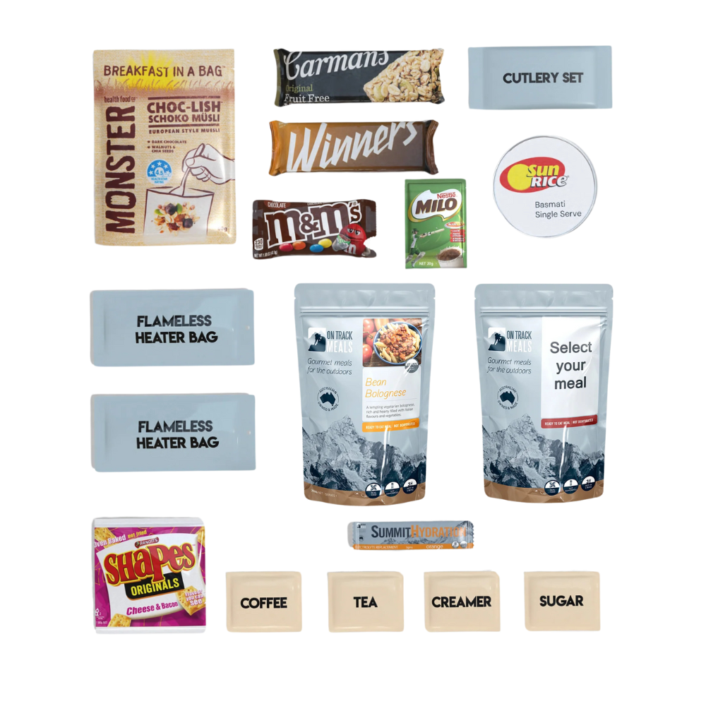 The Go Pack has breakfast, lunch, dinner and snacks, as well as hot drinks, hydration and cutlery. Also thrown in are 2x the Flameless Heater Bags, in case you don't have the chance to boil water.