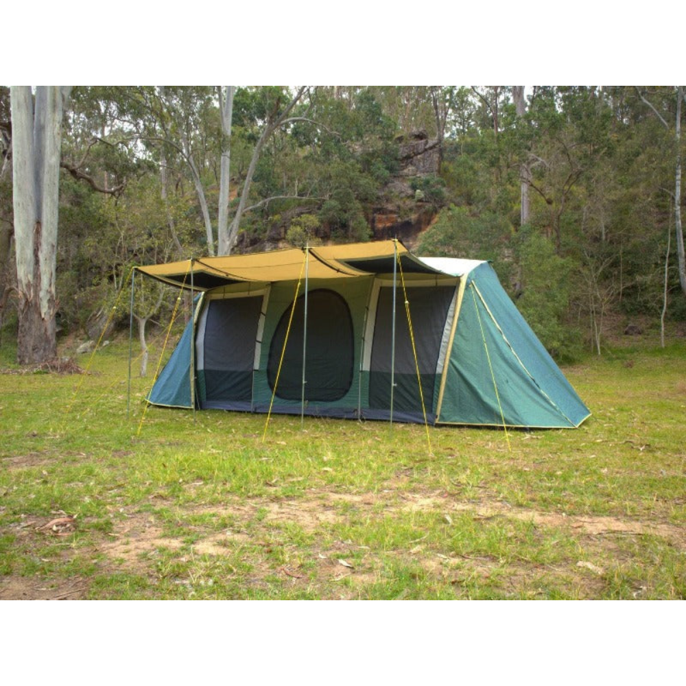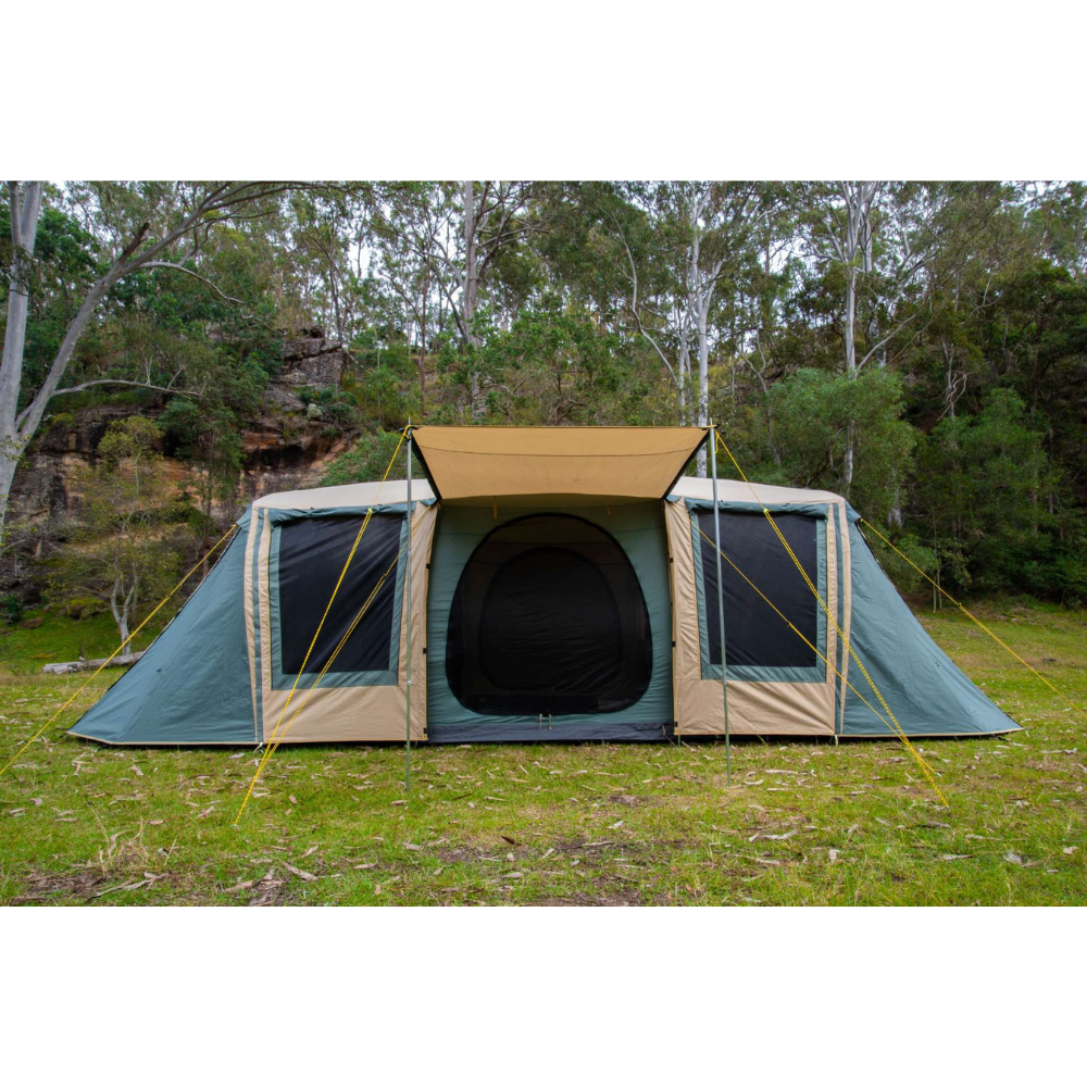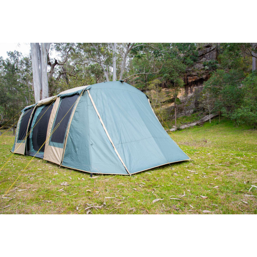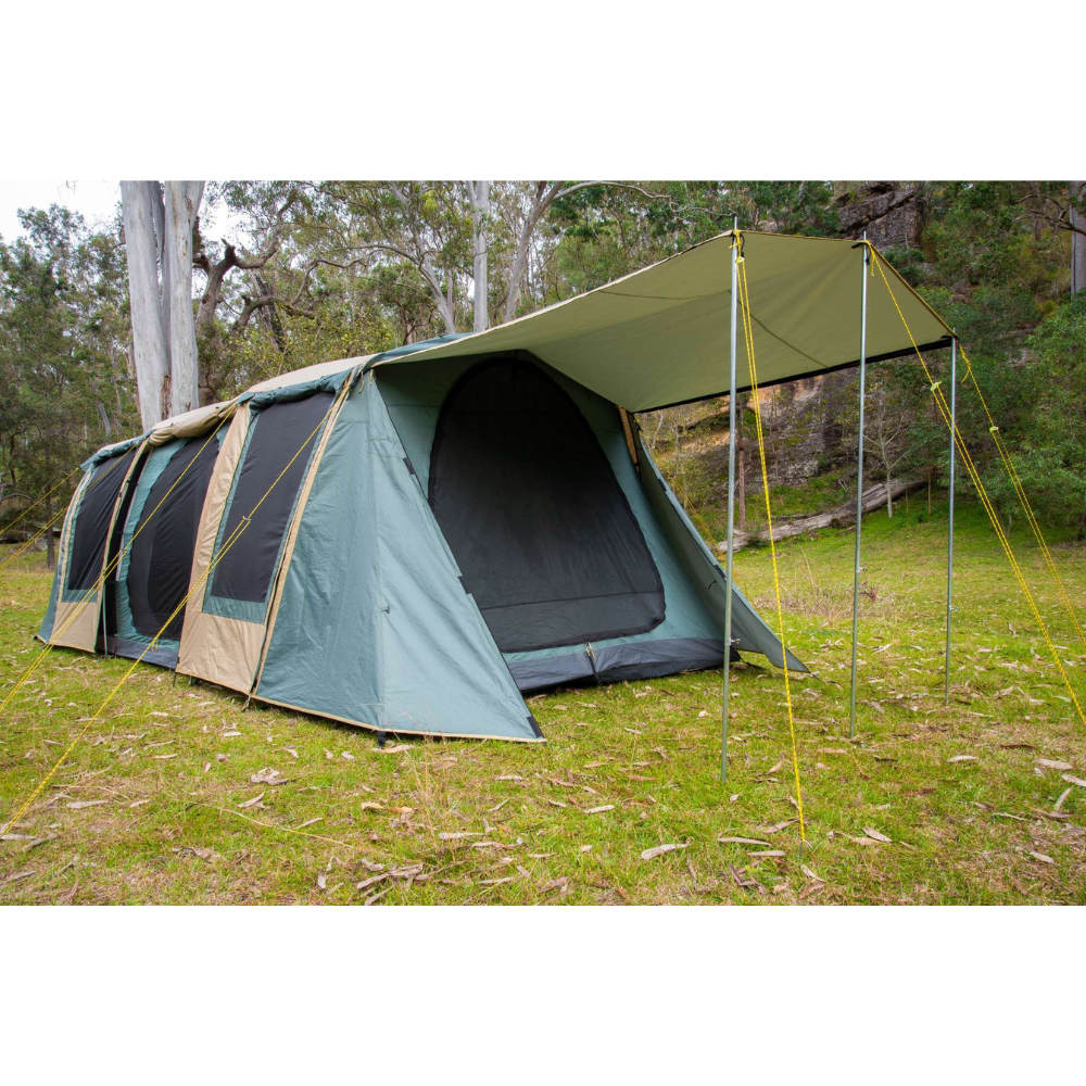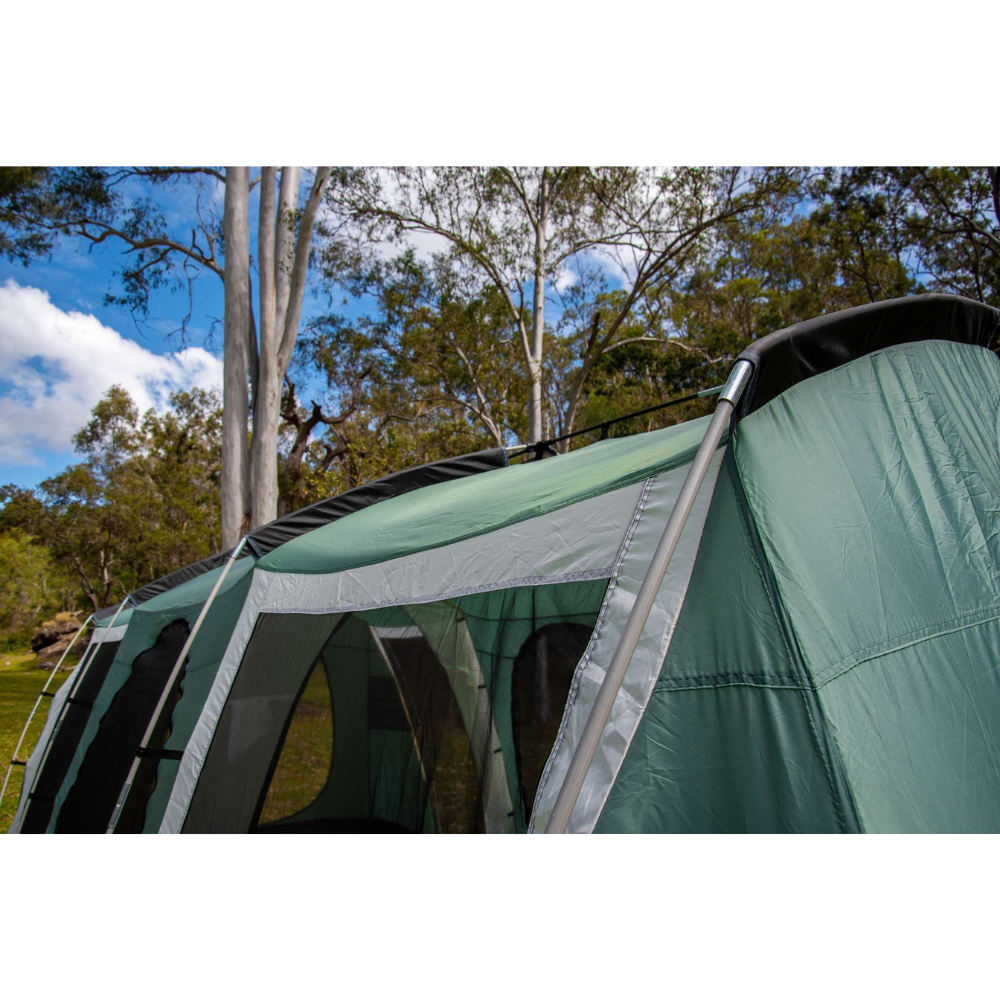 The three bedrooms have fully sewn-in dividing walls to completely separate the space and all doors and windows have privacy screens. There are large awning formed on the sides of the tent which can be poled out to be used as an awning or even zipped together in order to form one long continuous awning along the sides of the Brampton!