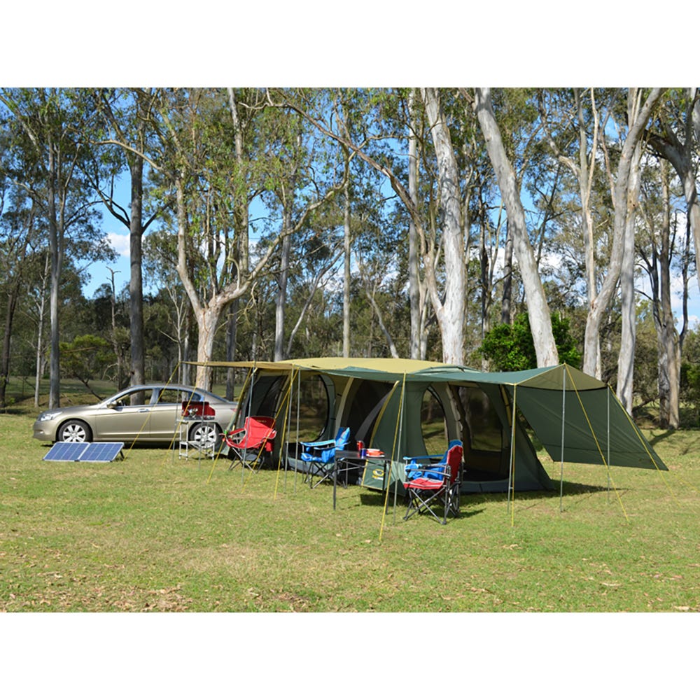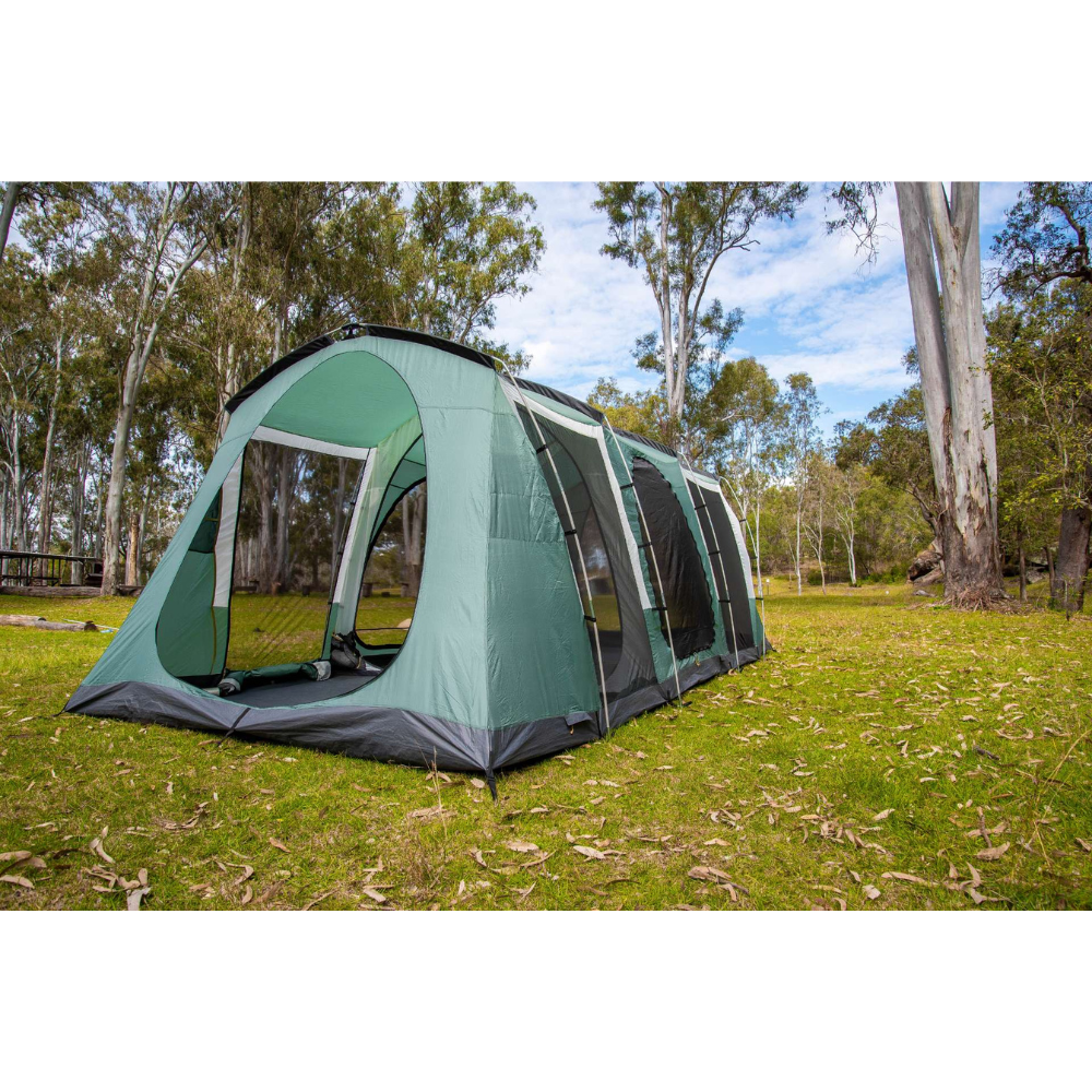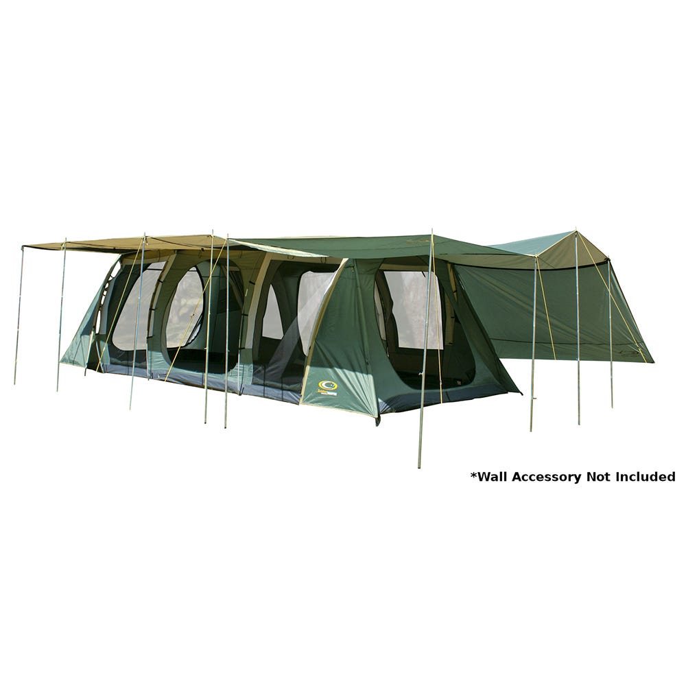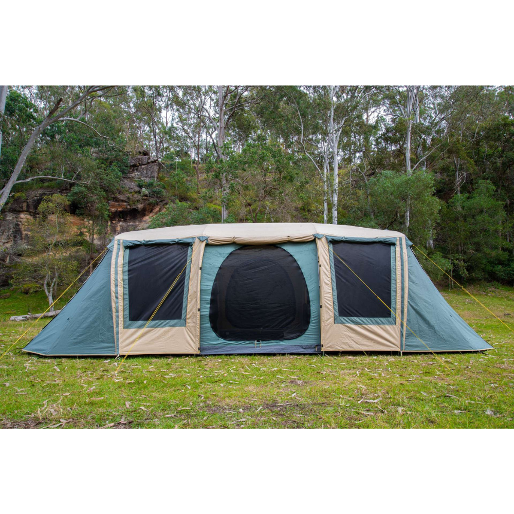 The three bedrooms have fully sewn-in dividing walls to completely separate the space and all doors and windows have privacy screens. There are large awning formed on the sides of the tent which can be poled out to be used as an awning or even zipped together in order to form one long continuous awning along the sides of the Brampton!