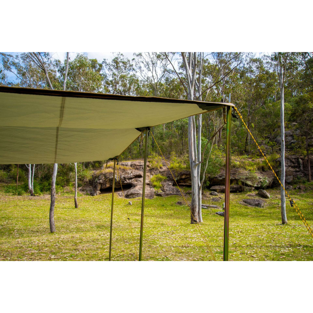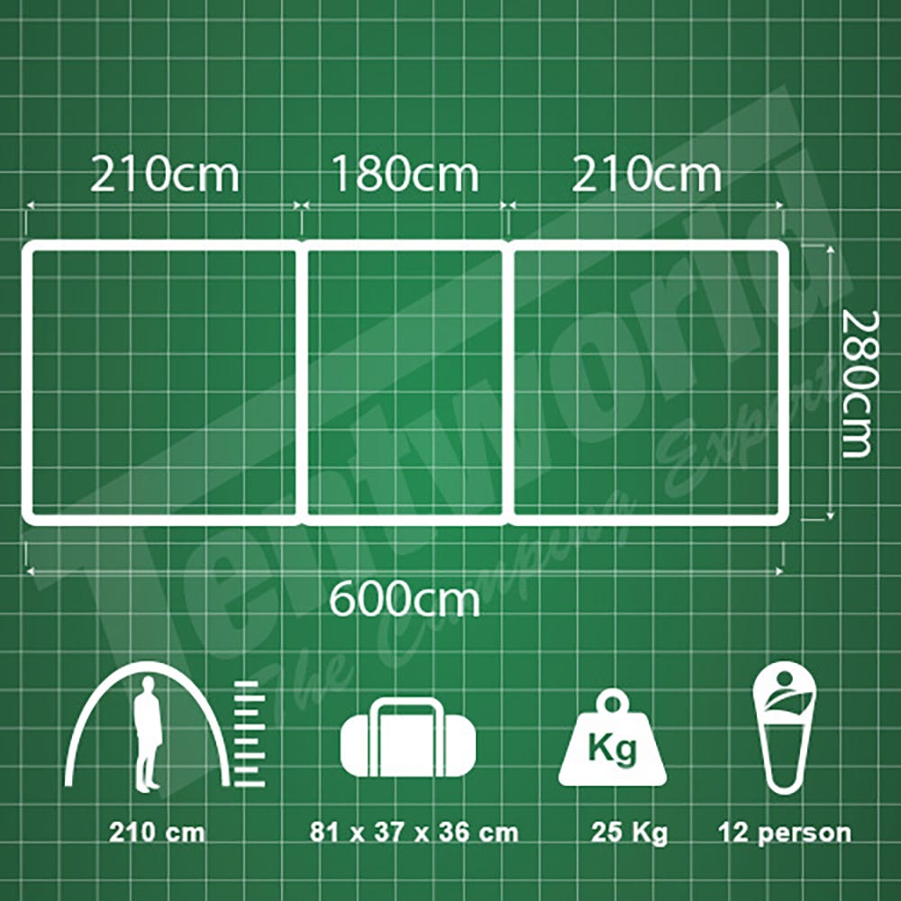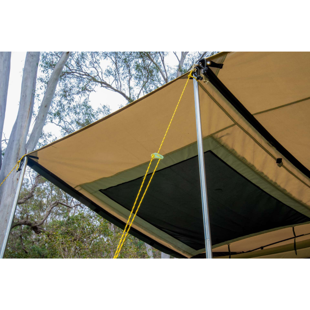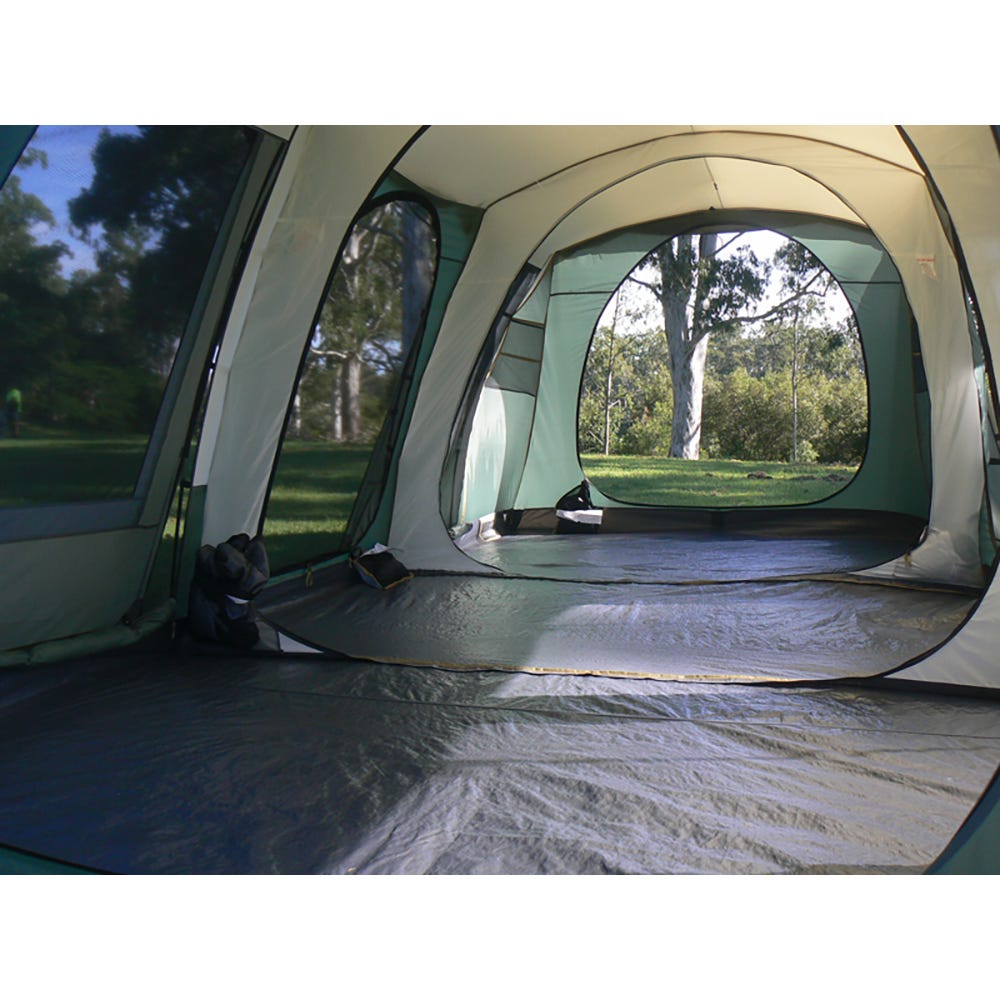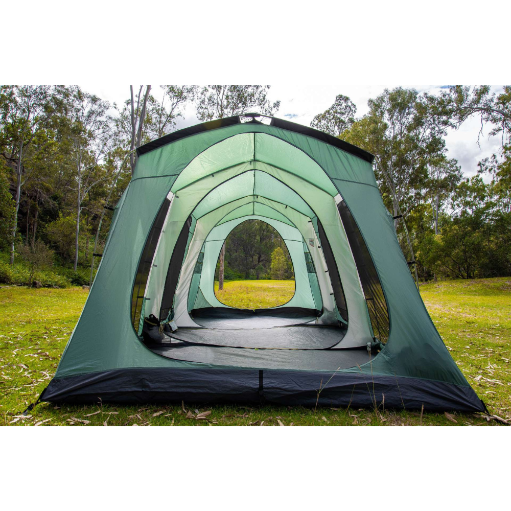 The three bedrooms have fully sewn-in dividing walls to completely separate the space and all doors and windows have privacy screens. There are large awning formed on the sides of the tent which can be poled out to be used as an awning or even zipped together in order to form one long continuous awning along the sides of the Brampton!