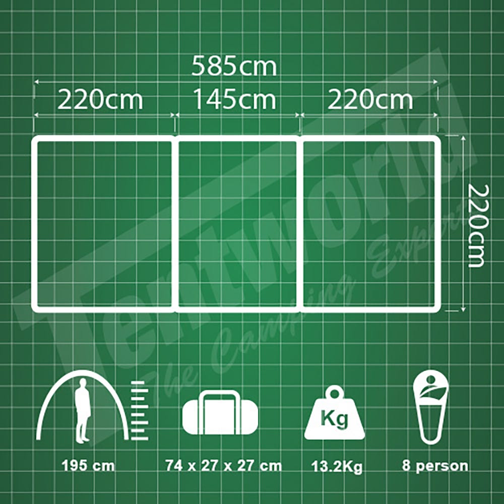 | Internal Dimensions | 585L (220 + 145 + 220) x 270/220W x 195H cm |