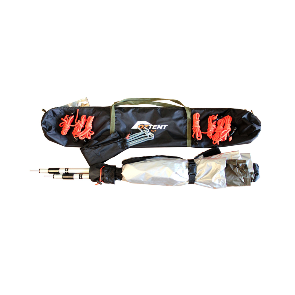 This enhanced Fly effortlessly zips onto the tent above the awning, providing added coverage over the sleeping area. It arrives complete with all essential poles, ropes, pegs, and a convenient carry bag. Specifically designed to complement the Oztent RV-3 (tent sold separately), this updated version promises an elevated camping experience with improved features and functionalities.