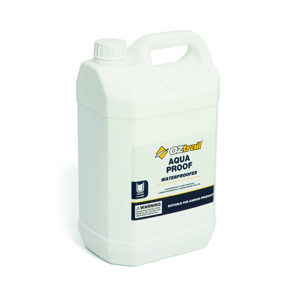 OZtrail Aqua Proof 5L is designed for waterproofing, restoring, and protecting weathered canvas fabric on your tent, awning, camper trailer, swag or other canvas products. Apply a thin coat to clean, dry material and allow roughly 3 hours to completely dry. For older and worn canvas, a second coat may be required paying attention to the areas that have creasing and folding. Always test on a small concealed area before use.