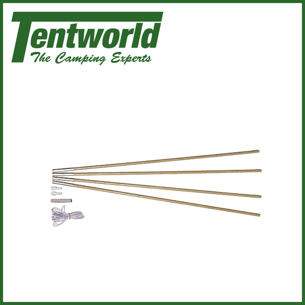 Each pole kit includes four pole sections, three meters of heavy duty shock cord, a pole tip and joiner. There is a size for every one of our tent styles.