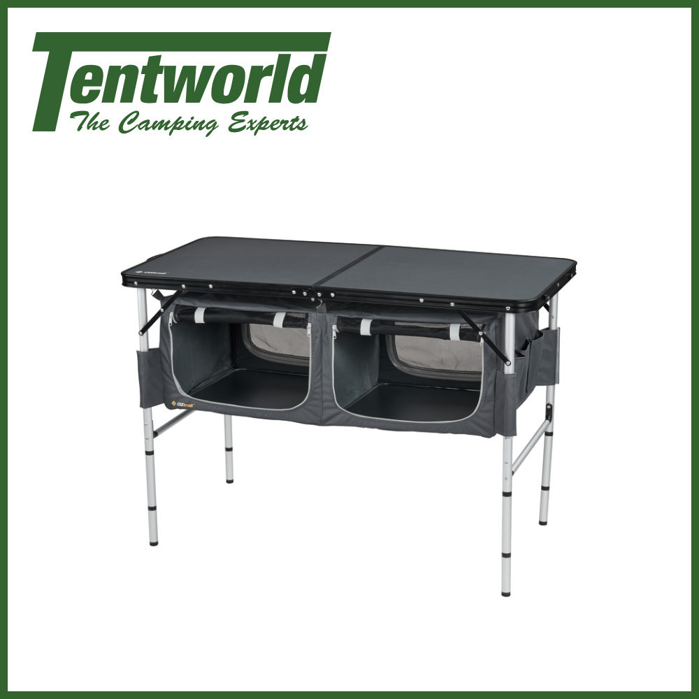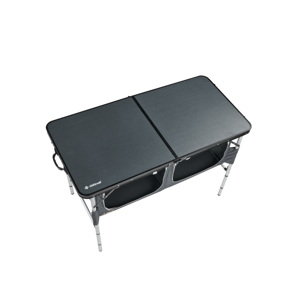 Sturdy aluminium folding table with storage underneath. Perfect for keeping your campsite neat and tidy so that you can enjoy your adventures.