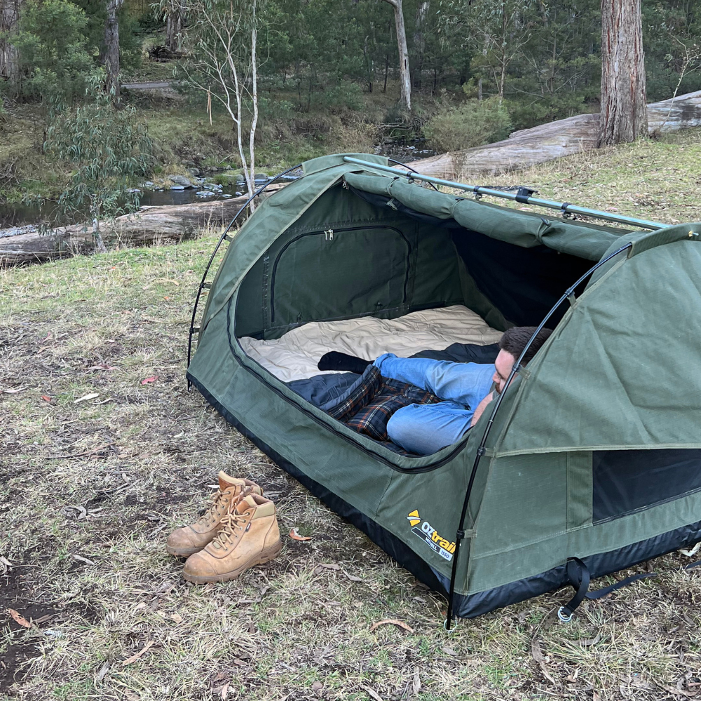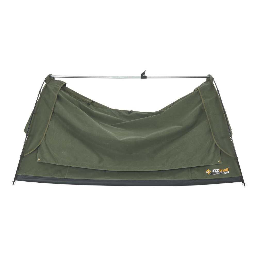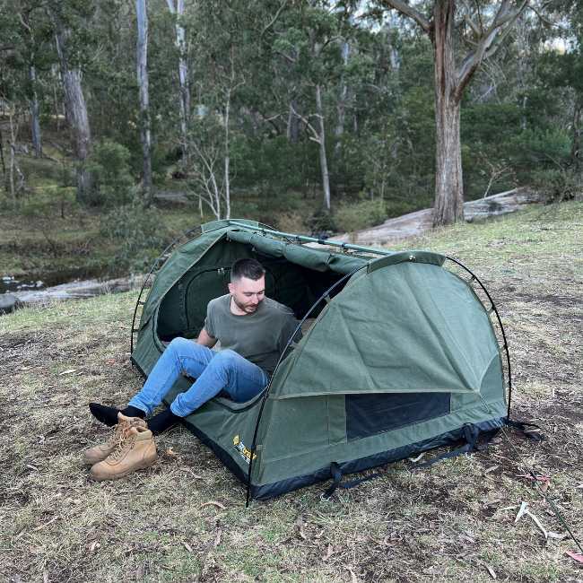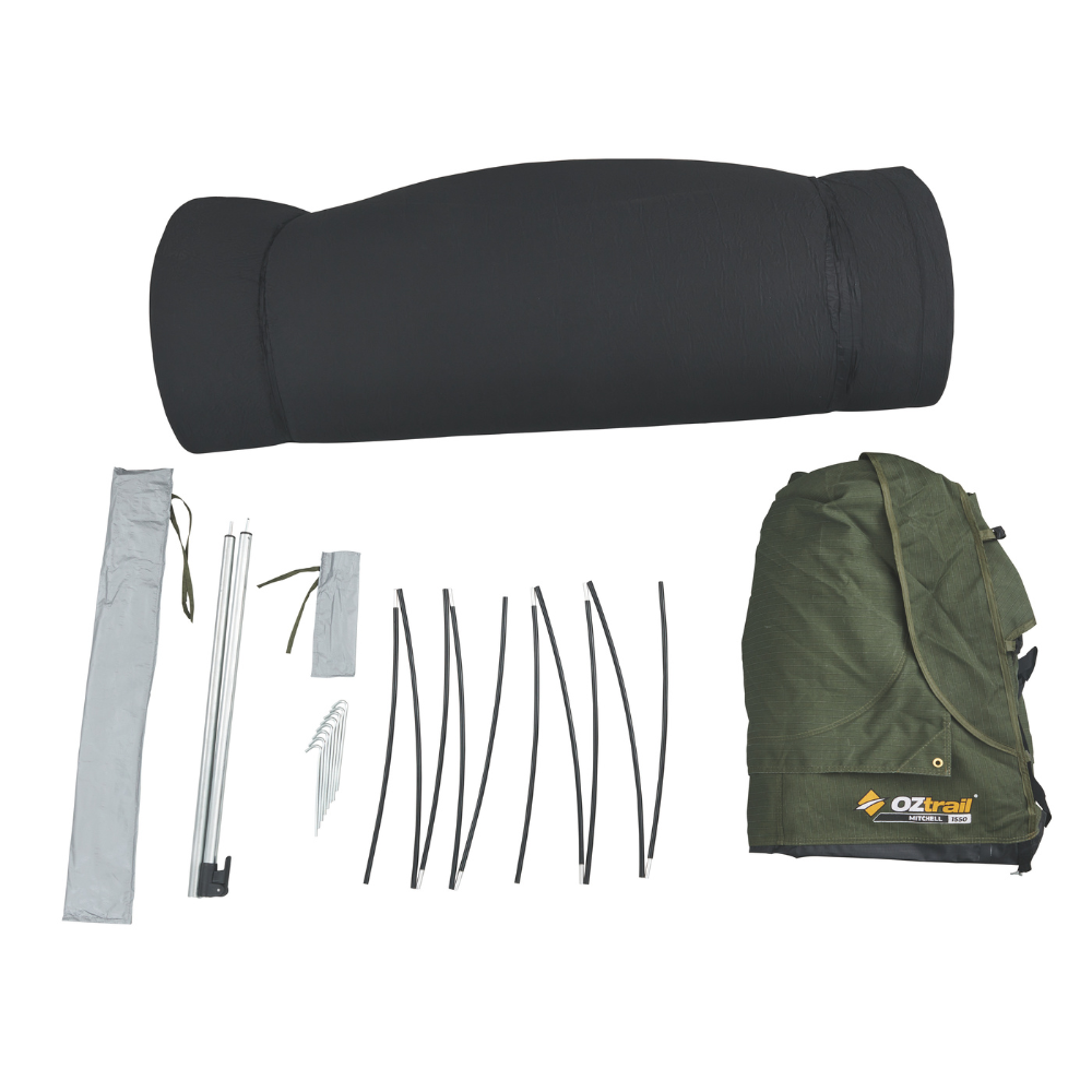 The Mitchell 1550 sleeps two people in comfort and provides a quick and easy to set up swag solution when hitting the road. This swag is constructed with a heavy duty, seam sealed 400GSM Ripsstop polycotton canvas material and a ultra-tough 440GSM PVC bucket floor to stand up to harsh terrain. Feauturing a free standing design for quick set up and extra internal space along with a comfortable 5cm high density foam mattress to give you a comfortable nights sleep. There's plenty of ventilation throughout thanks to the zippered head and foot windows, along with the full sized mesh door on the sides for great cross airflow. The integrated compression straps makes pack down a breeze, and ensures a compact pack size when hitting the road.