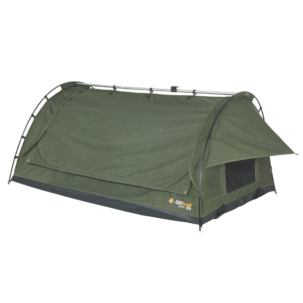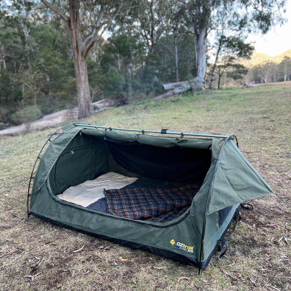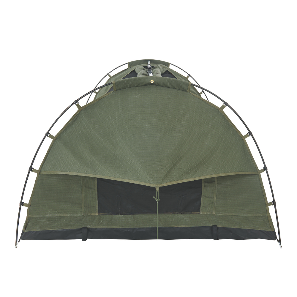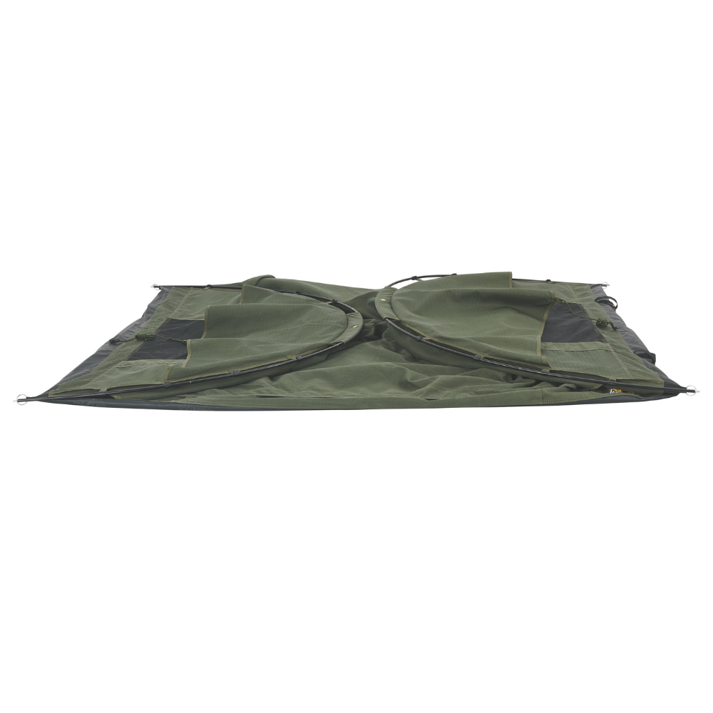 The Mitchell 1550 sleeps two people in comfort and provides a quick and easy to set up swag solution when hitting the road. This swag is constructed with a heavy duty, seam sealed 400GSM Ripsstop polycotton canvas material and a ultra-tough 440GSM PVC bucket floor to stand up to harsh terrain. Feauturing a free standing design for quick set up and extra internal space along with a comfortable 5cm high density foam mattress to give you a comfortable nights sleep. There's plenty of ventilation throughout thanks to the zippered head and foot windows, along with the full sized mesh door on the sides for great cross airflow. The integrated compression straps makes pack down a breeze, and ensures a compact pack size when hitting the road.