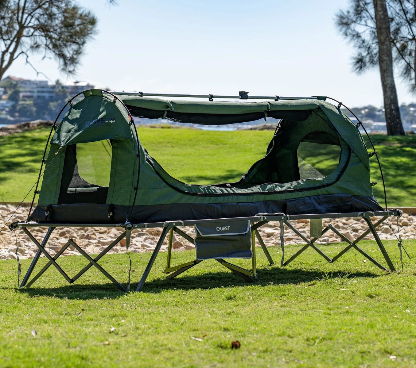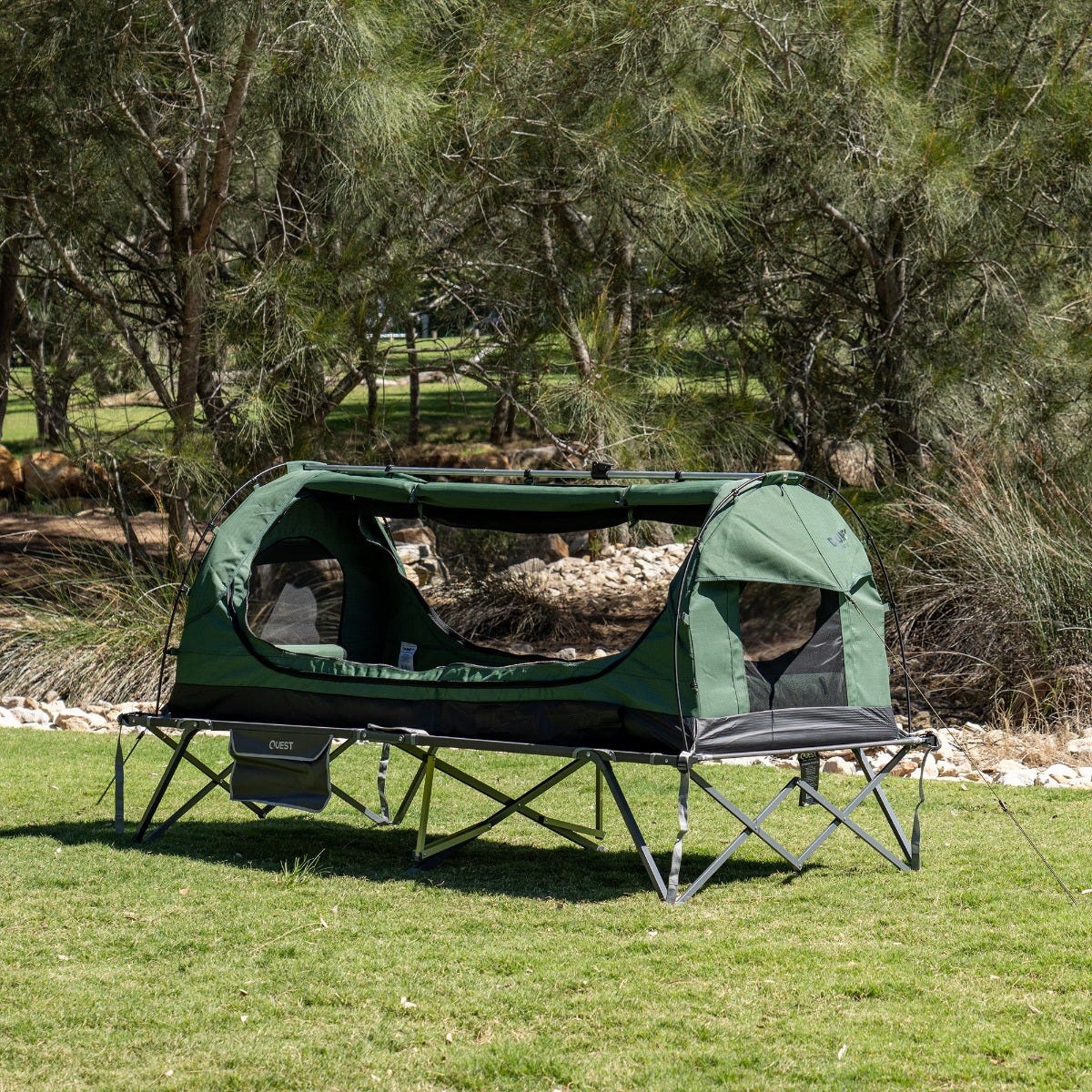 The crossbow 1 swag stretcher is the supreme stretcher for those who have big dreams in the outdoors. With an amazing length of 228 cm, a generous 110 cm width and 42cm of height, it's one of the biggest single stretchers that can support a large swag comfortably. The adjustable connection straps and buckle system will keep your swag secure to the stretcher. With its quick and easy setup, you can get to bed with your essentials tucked away in the water-resistant gear pocket. It boasts a heavy-duty steel frame with centre vertical supports which gives you the support where you need it the most, right in the middle where you sit to enter your swag.