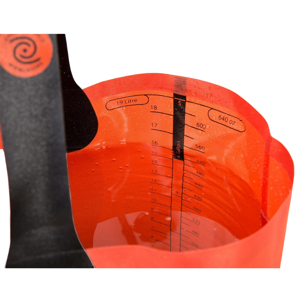 The ideal lightweight solution for carrying and storing water in the outdoors. Made from non-absorbent, food grade, coated fabric, the additional handle on the base makes pouring easy. The carry handle is also manufactured with a Dual Layer 420D Nylon that is RF welded to the main body of the bucket. The included pouch is also quite small, convenient and has a zipper for easy access.