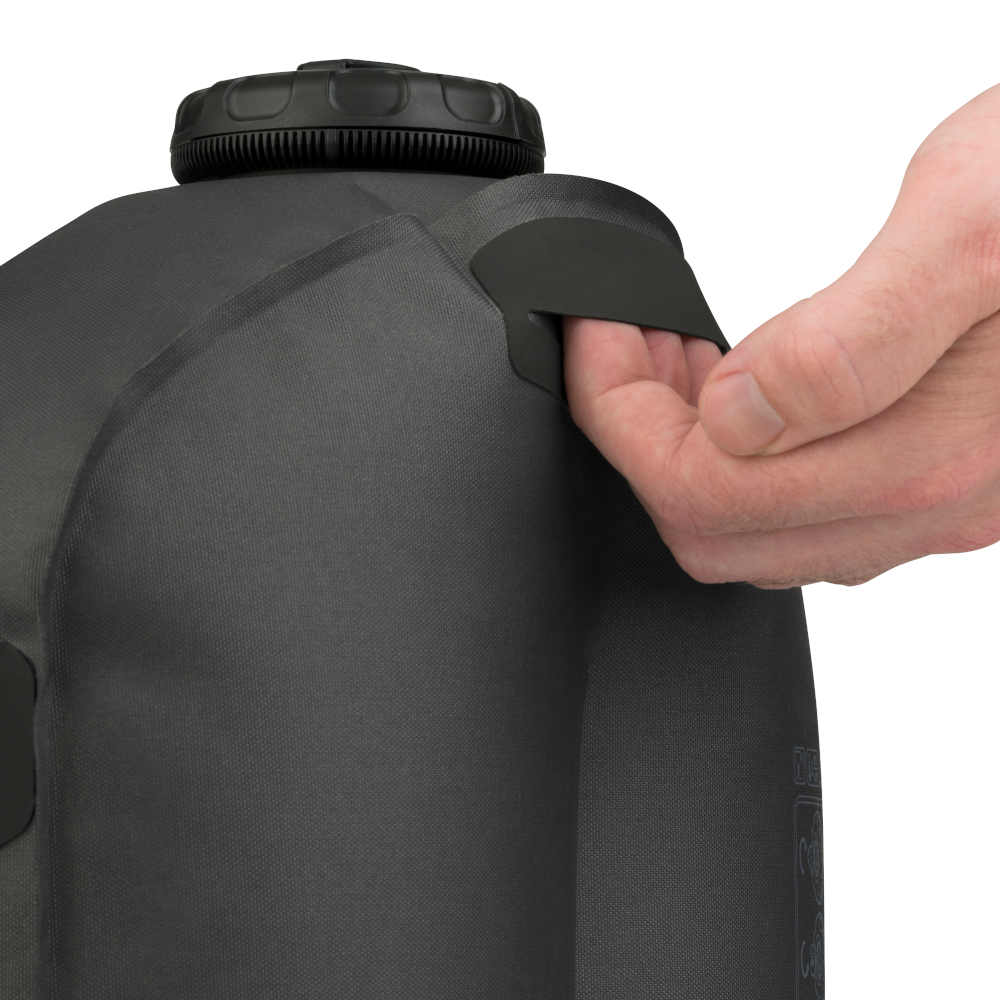 Its waterproof webbing strap provides adjustable handles for carrying, multiple lashing point options, and a hook buckle for effortless hanging. The strategically positioned fill-handle makes filling easy while the upright cell structure provides efficient use of the internal volume and allows the Watercell X to drain completely for drying at the end of a trip.