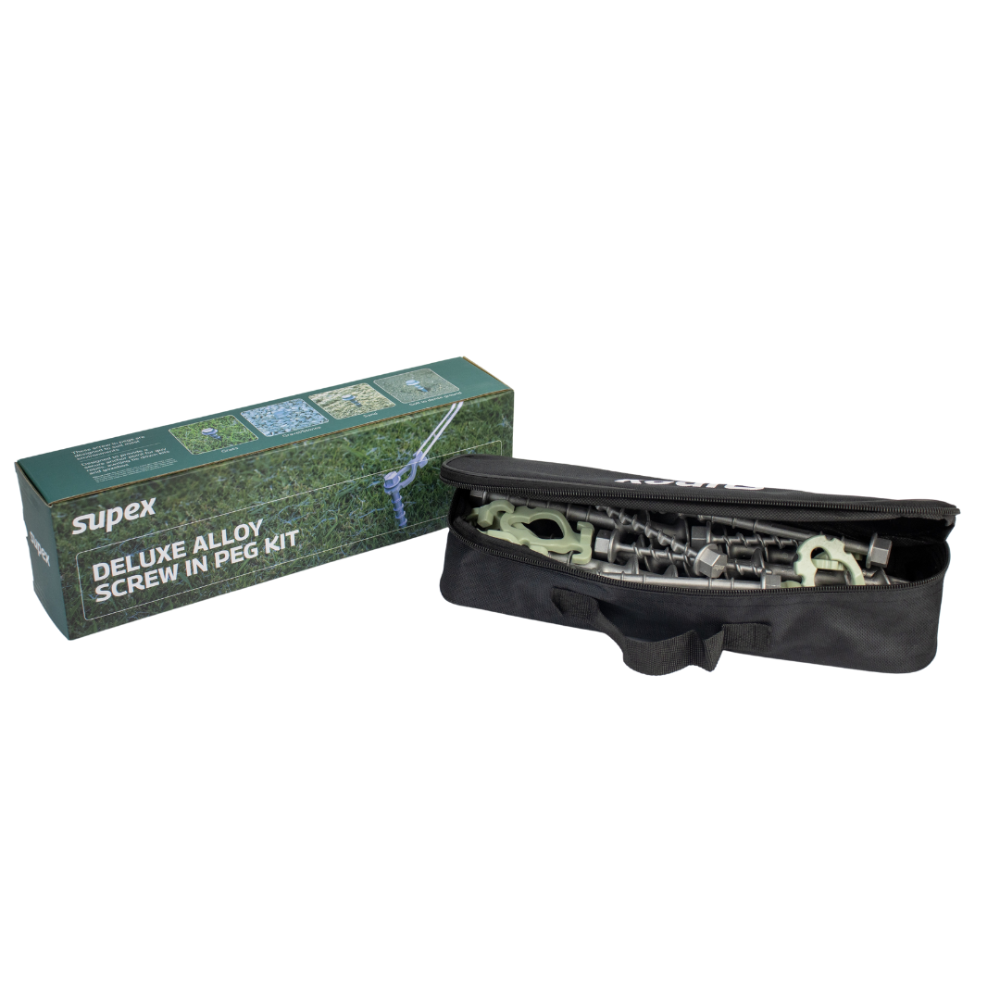 The SUPEX Alloy Screw-In Peg Kit – Deluxe is the all-in-one solution for secure, stable setups in any outdoor environment. It includes 12 alloy screw-in pegs—four large (30cm), four medium (20cm), and four small (12cm)—each with matching rope clips, plus a 17mm drill adaptor and a convenient carry bag.