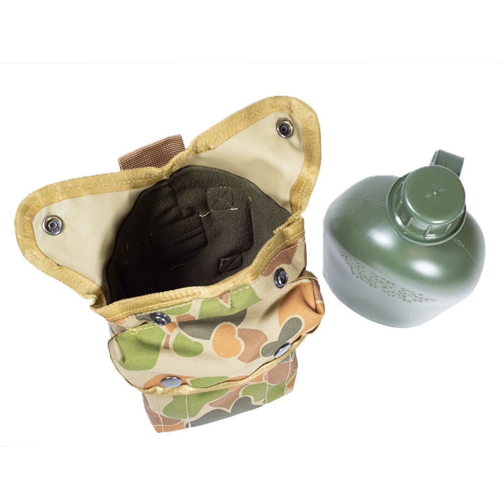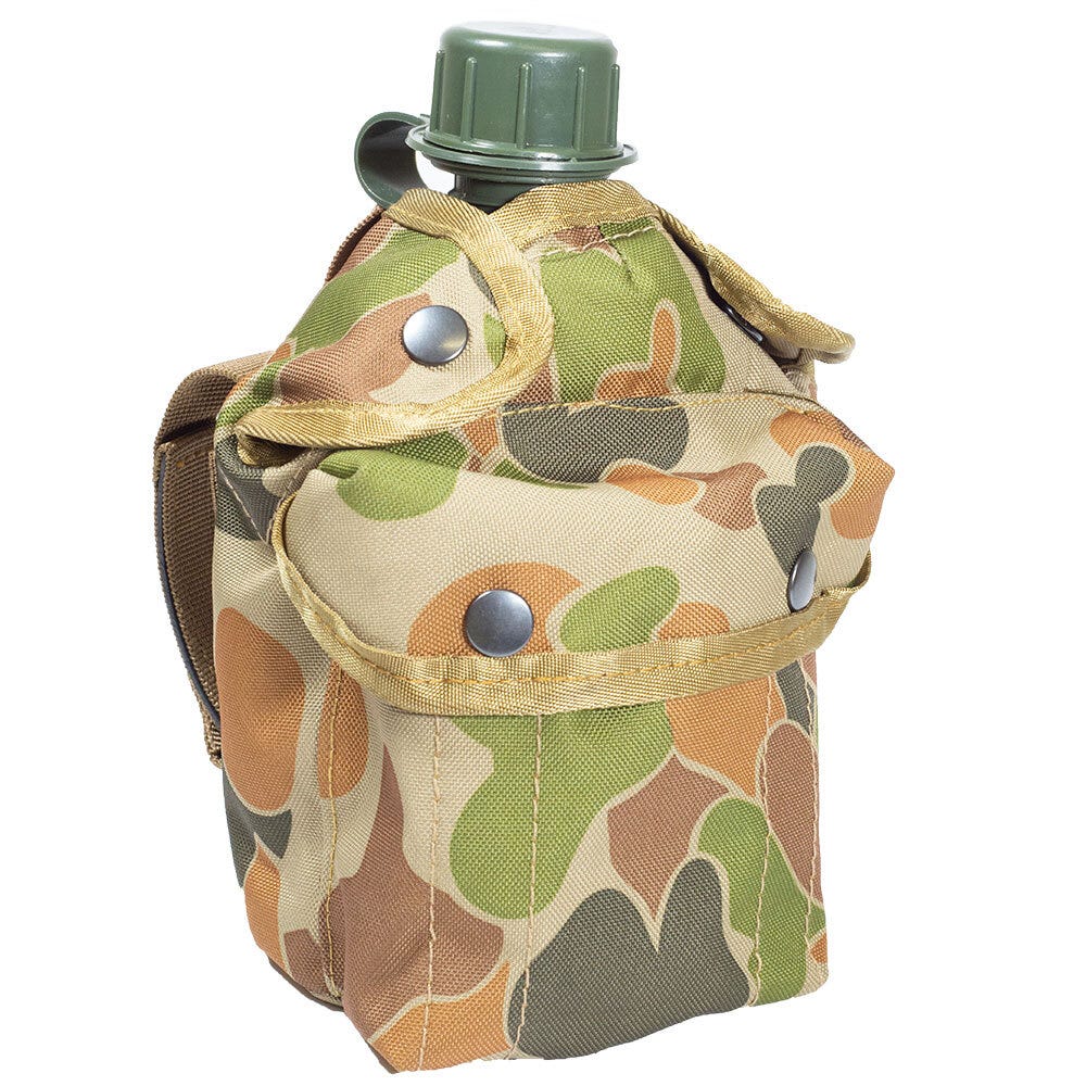 The TAS Combo 1L Canteen Water Bottle + Auscam Canteen 12 Pouch is perfect for all military, outdoor events, sporting events and camping adventures! The 1L Canteen Water Bottle is made from heavy duty food grade plastic, and the Auscam Canteen 12 Pouch is made from military specified cordura fabric with a double PU coating. The Canteen Pouch will fit the water bottle perfectly, has MOLLE fittings and nylon webbing.