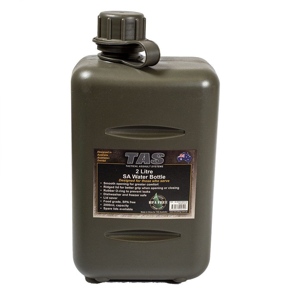 The TAS South African 2L Water Bottle is made from heavy duty food-grade plastic with a South African military design. This army green coloured drink bottle fits inside the TAS Large 3374 Pouch, and is ideal for military, hiking, camping and other outdoor adventures.