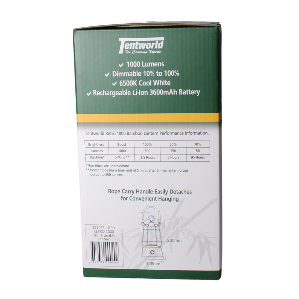 The Tentworld Retro 1000 Lumen Lantern is the ultimate combination of classic design and modern functionality. With its 1000-lumen Cool White Light Boost (500 lumen on high), this lantern is perfect for any outdoor adventure. Whether camping, hiking, or simply needing a reliable light source during a power outage, this lantern has got you covered.