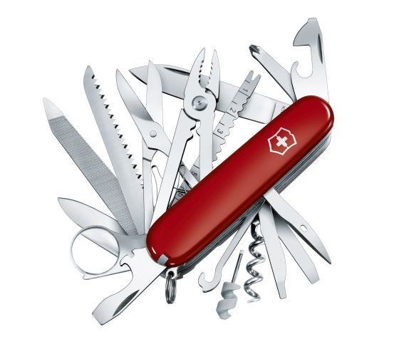 The Swiss Champ can be considered Victorinox's current masterpiece. Consisting of 8 tool layers containing almost every tool, it is still small and light enough to be carried in a pocket.