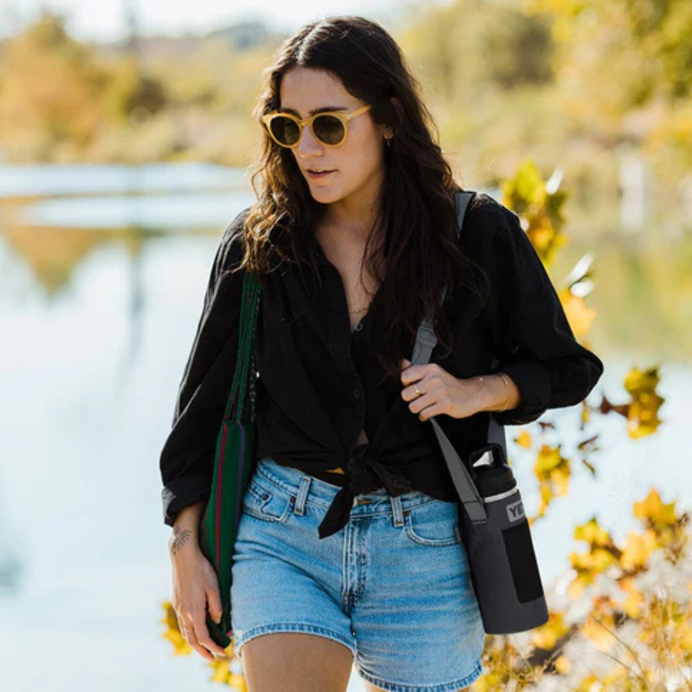 Just throw the Rambler Bottle Sling over your shoulder and go.