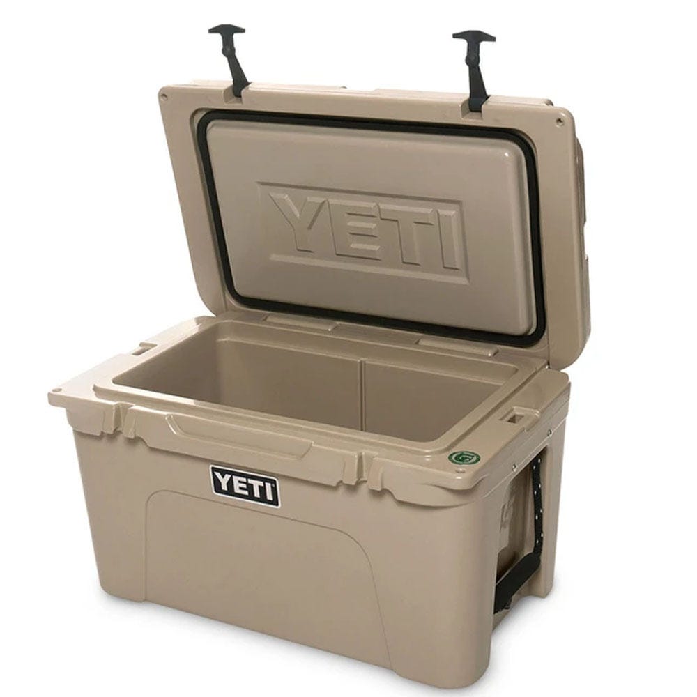 The YETI® Tundra® 45 combines versatility with durability. This premium cooler is infused with that legendary YETI toughness, a durable rotomolded construction and up to two inches of PermaFrost Insulation. It's UV-resistant and damn-near indestructible. The durable, marine-grade polyester rope handles with textured grips let you easily haul your Tundra 45 to the campsite and out on quick camping excursions. It's also great for a day on the lake, due to its molded-in tie-down slots and non-slip feet.