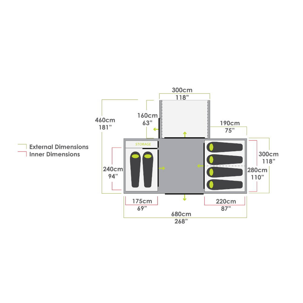 Youโll enjoy superior features, privacy and fast inflation with our new Zempire Pro II V2 Air Tent. The fully inflatable frame with a central cross structure provides increased stability and a generous living space with increased privacy via the two individual bedrooms. The front awning area can be attached to either an optional awning wall set to enclose, or an Aerobase shelter to provide a truly connected living space.