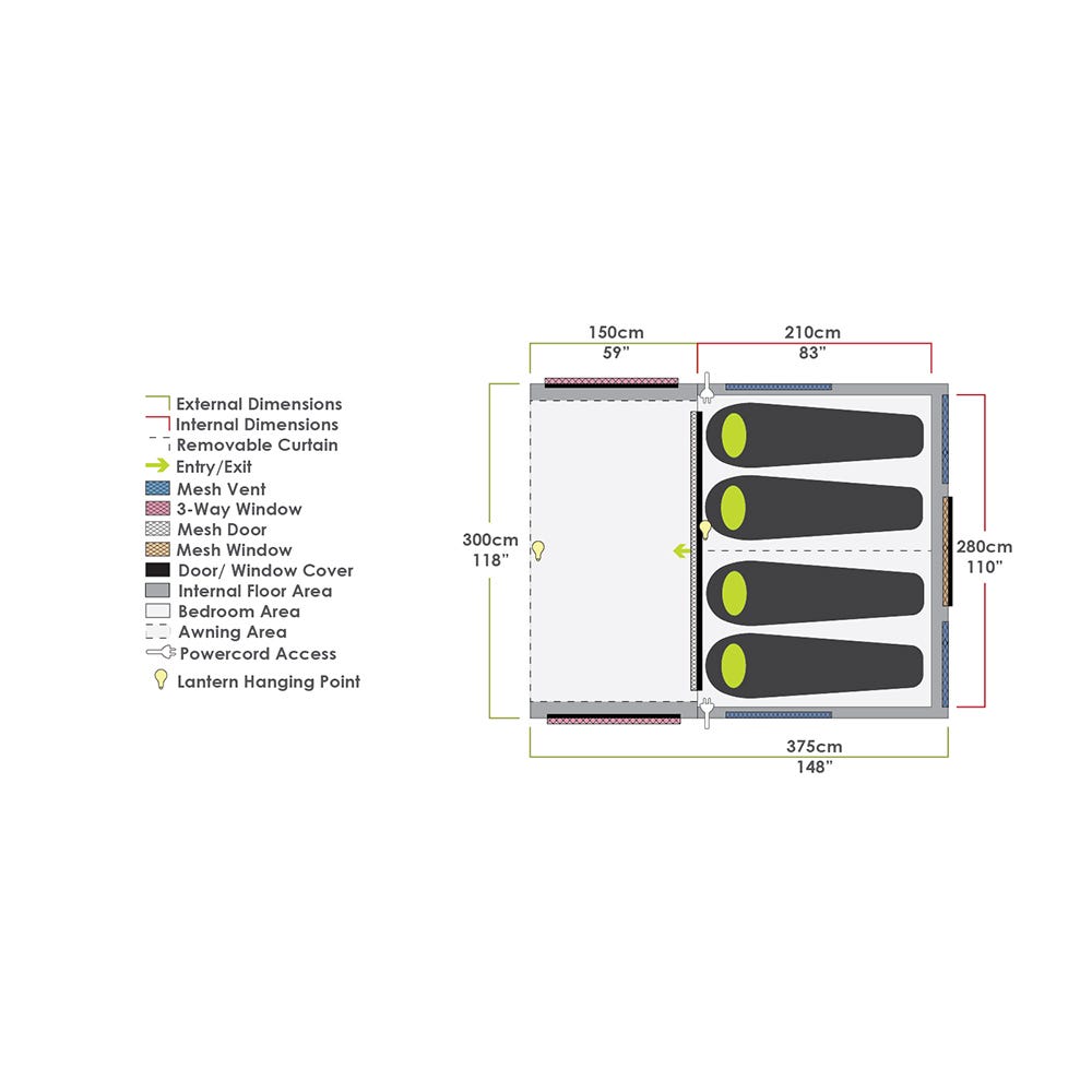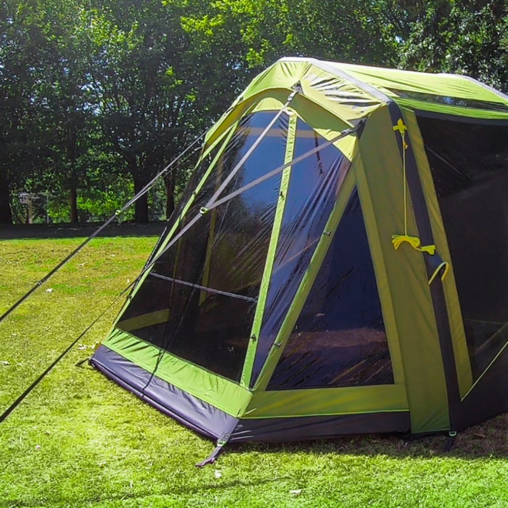 Sewn in ground sheet, Integrated air frame, Carpet attachment rings, Tinted skylights