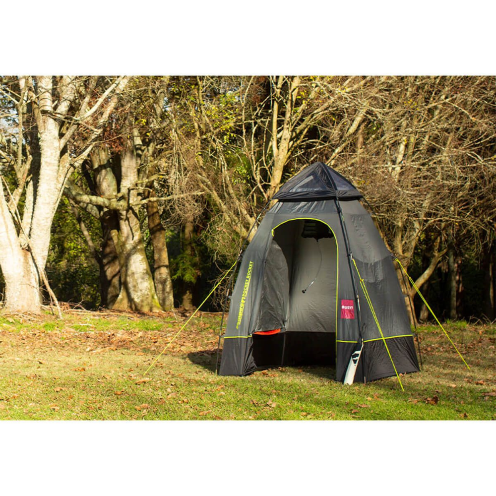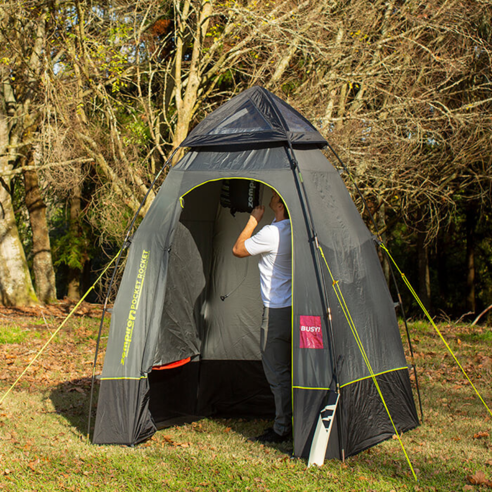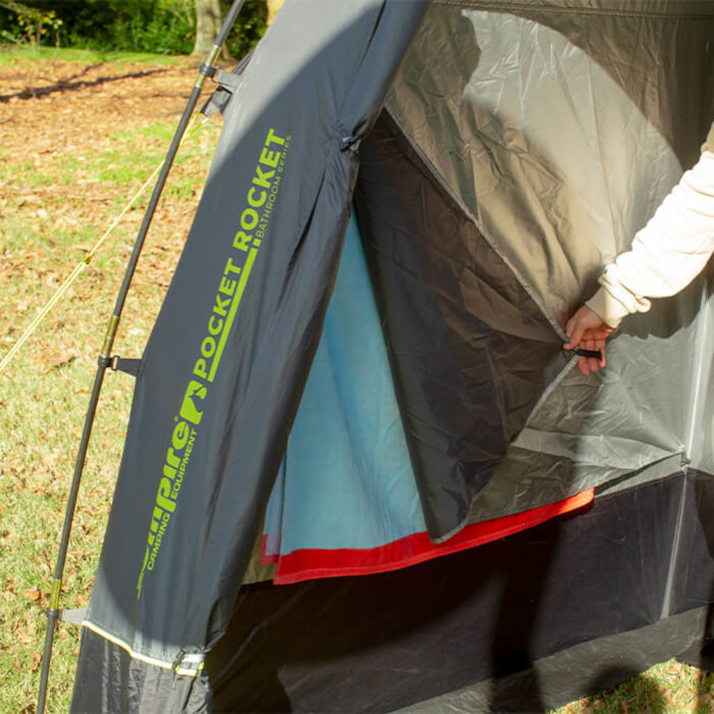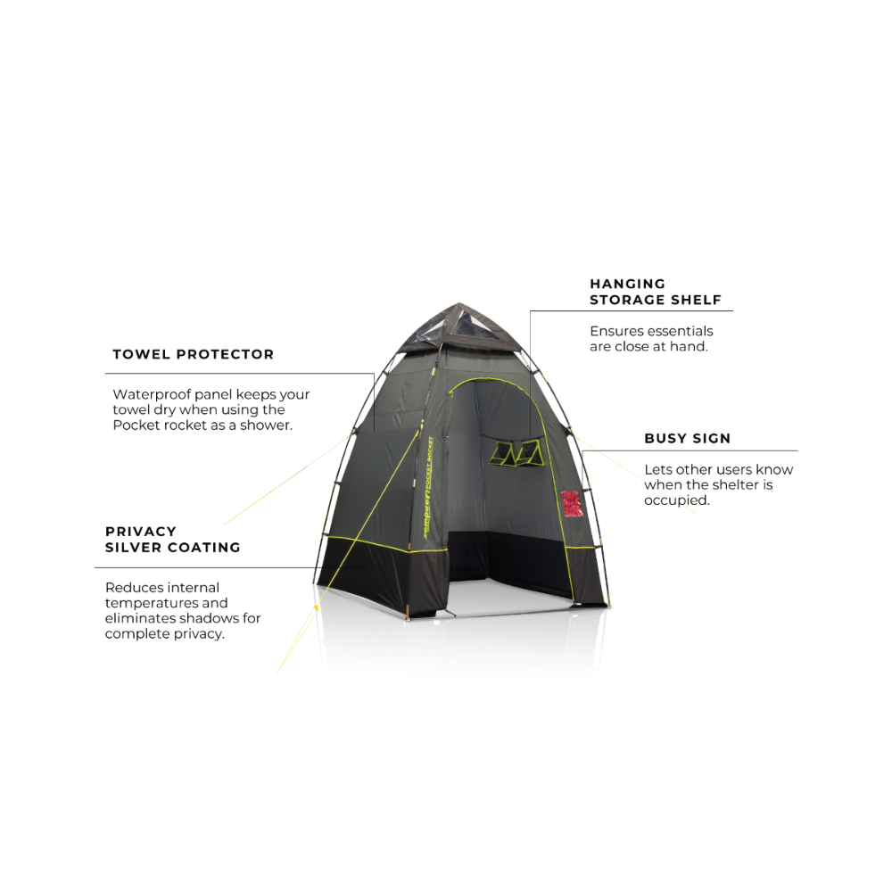 Enjoy privacy and convenience anywhere with the Pocket Rocket Shower Tent—a versatile utility tent designed for use as a changing station, toilet shelter, or shower tent. With a tall profile and sturdy fibreglass frame, it provides a stable and spacious setup for all your campsite needs.
