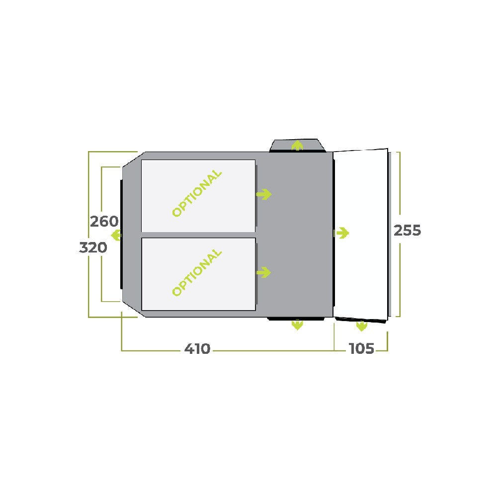 If more sleeping space is required outside the van, optional bedrooms can be attached to either side of the Roadie 6. A great feature of the Roadie 6 is that there continues to be internal living space even when both optional bedrooms are attached.