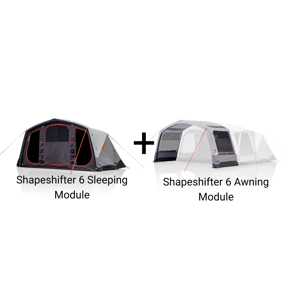 Experience the absolute ultimate family camping setup with the Zempire Shapeshifter 6 SA Bundle; a modular air tent system combining a Shapeshifter 6 Sleeping Module and a Shapeshifter 6 Awning Module to create a luxurious camping mansion.