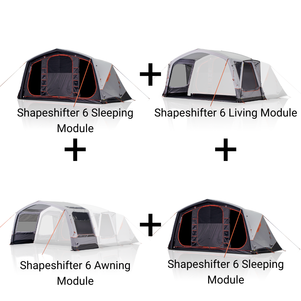 Experience the absolute ultimate family camping setup with the Zempire Shapeshifter 6 SLAS Bundle; a modular air tent system combining two Shapeshifter 6 Sleeping Modules, a Shapeshifter 6 Living Module and a Shapeshifter 6 Awning Module to create a luxurious camping mansion.