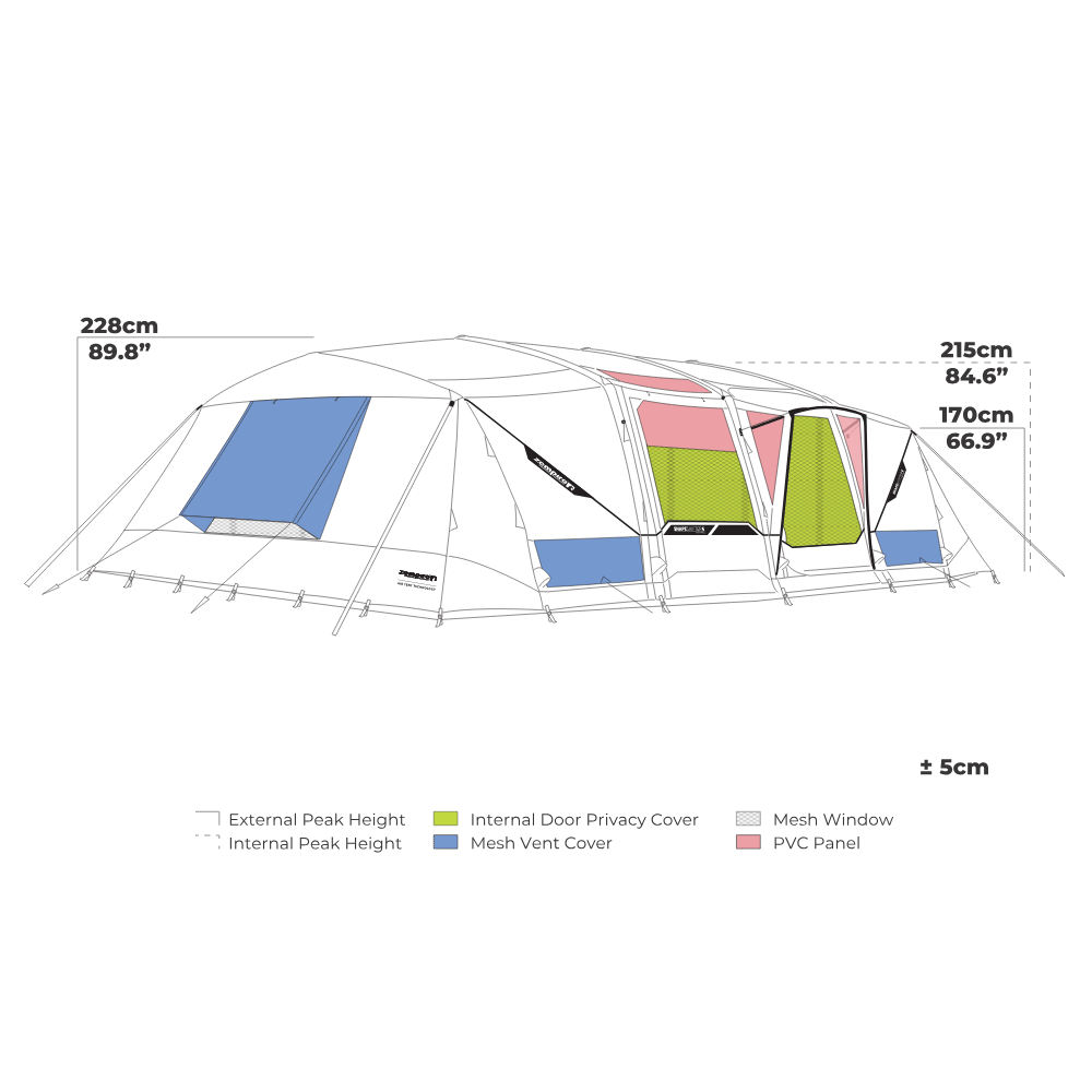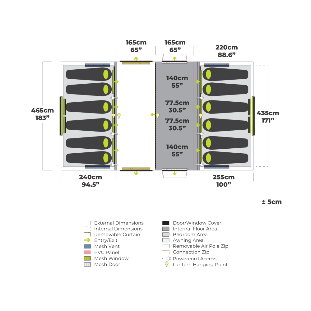 - Floor Dimensions: 605 L x 435 W cm (excludes Awning)