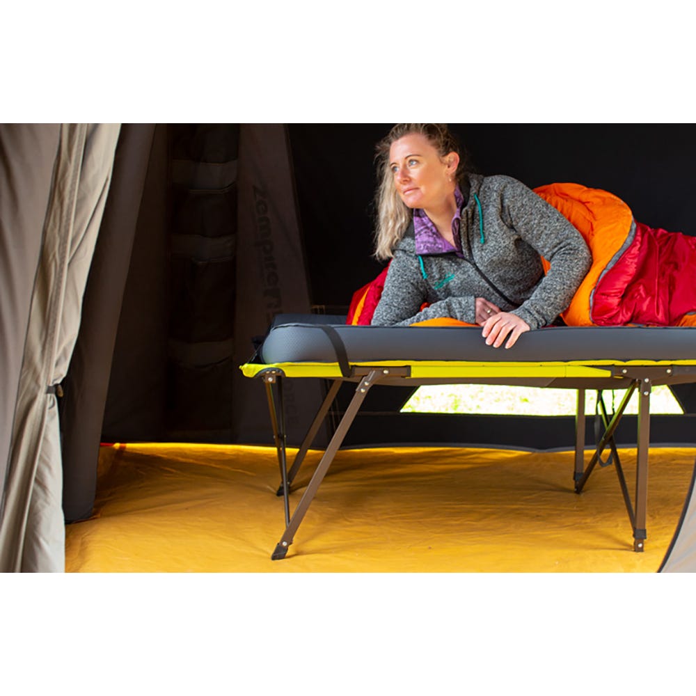 The Speedy Bed King Single V2 is a long and wide camping stretcher with a sturdy steel frame. Perfect for taller campers or for pairing with a MonstaMat King Single. The fully folding frame means no assembly is required, the Speedy Bed deploys with a simple flick of the wrist. Stable leg angles and heavy-duty materials give you a solid structure that is comfortable and supportive to sleep on.