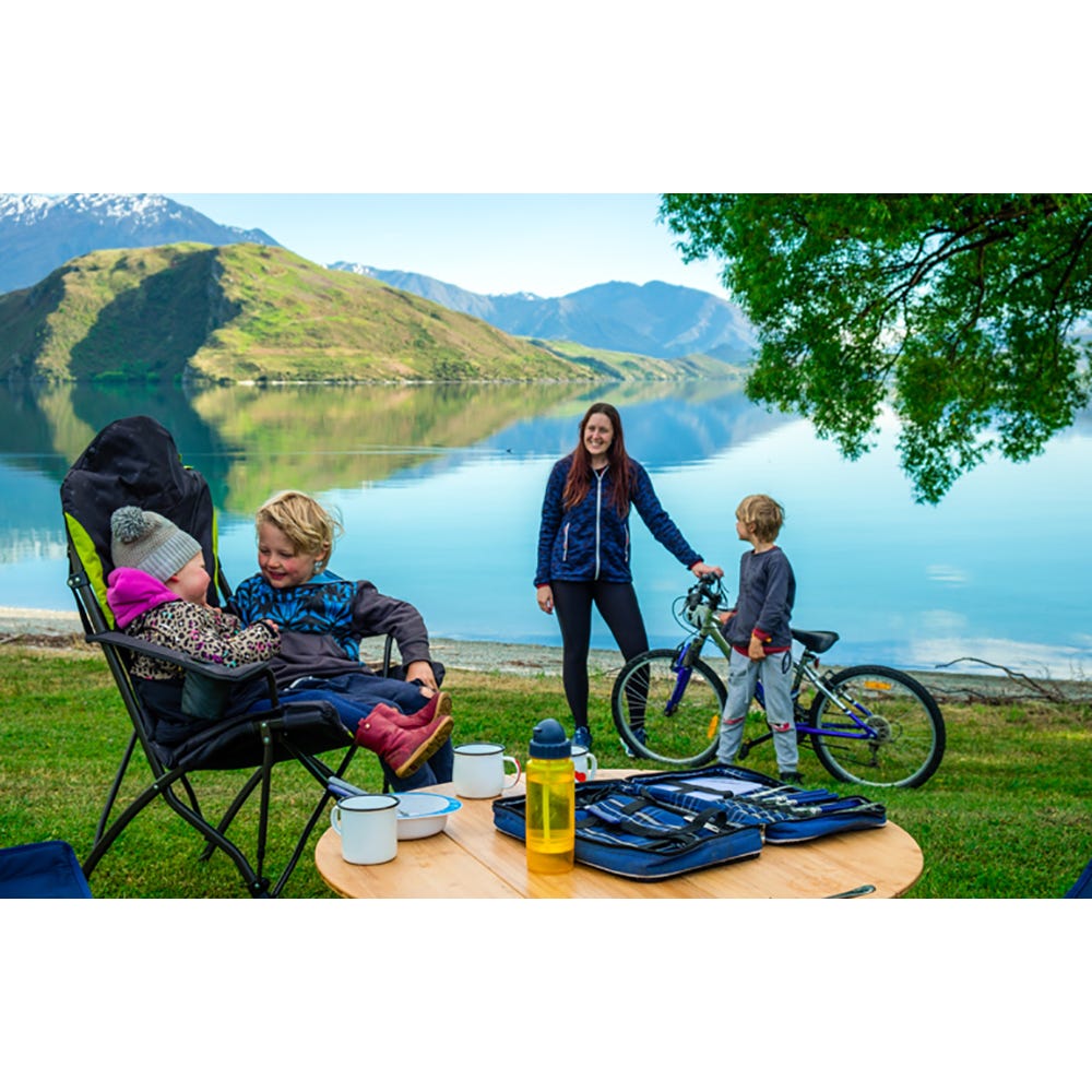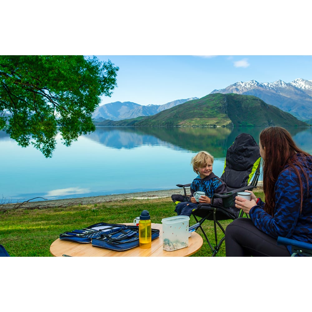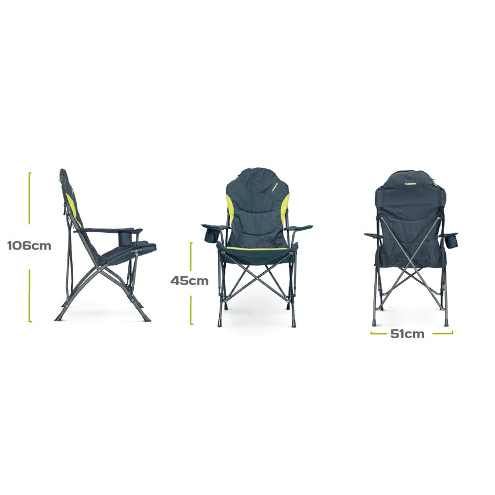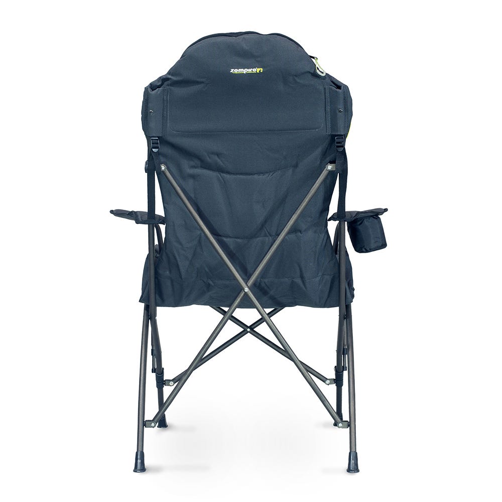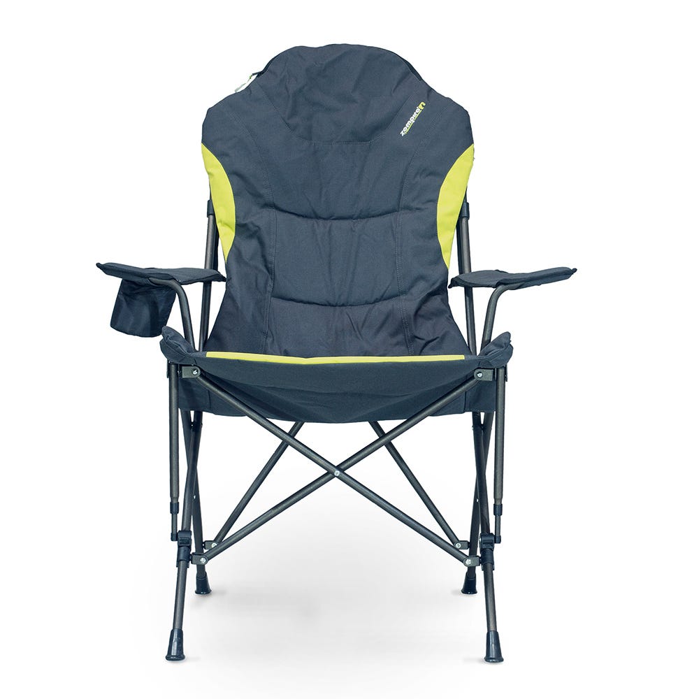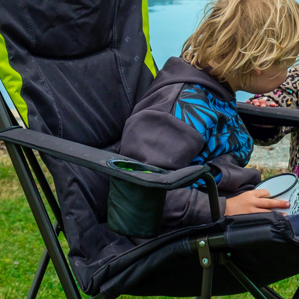 The zippered opening at the top offers the perfect storage space for your carry-bag, creating an integrated pillow. Adjustable arm straps allow you to customize the arm height to suit any user. A built-in insulated cup holder guarantees that your drinks stay cold on hot summer days.